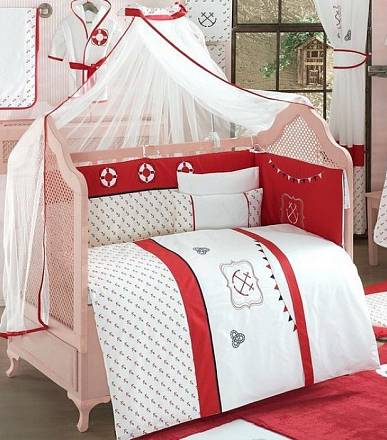 Комплект «Red Ocean» выполнен в морской тематике, сочетанием хлопкового текстиля белого и красного цвета. Пододеяльник и защитный бампер украшает вышивка с изображением корабельных якорей и спасательных кругов. Будущий капитан будет спокойно засыпать в своей кроватке, украшенной этим комплектом.