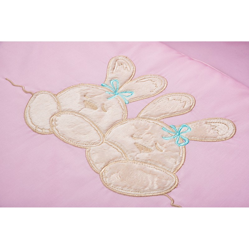 - Пододеяльник и приходящаяся на изголовье часть бортика декорированы атласной вышивкой с изображением пары очаровательных зайчиков.