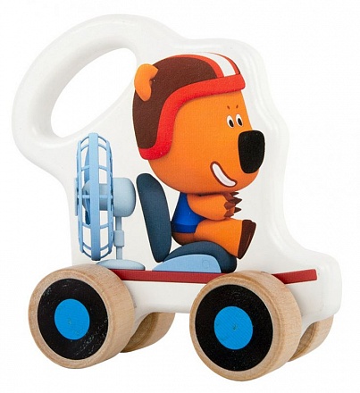 На маленькой каталке с ручкой изображен знакомый для детей персонаж – мишка Кеша из мультфильма «Ми-ми-мишки». Она полностью выполнена из дерева, поэтому малышам будет приятно в неё играть. Твердые колеса хорошо ездят по разным поверхностям.