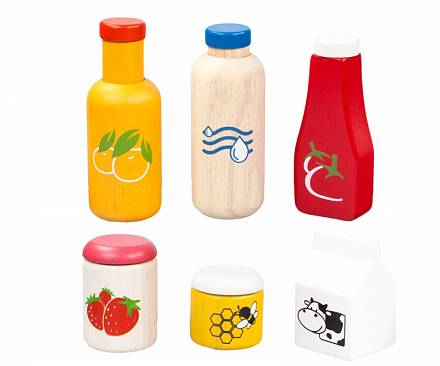 Набор от компании «Plan Toys» станет прекрасным дополнением детской игровой кухни или может использоваться в качестве товара для игры в магазин. Дети придумают много разнообразных сюжетов для игр с деревянными муляжами: бутылочками, баночками и пакетами с напитками и едой.