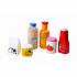 - Набор представлен 6-ю предметами: баночками, бутылочками и пакетами с кетчупом, медом, апельсиновым соком, клубничным джемом, водой и молоком.