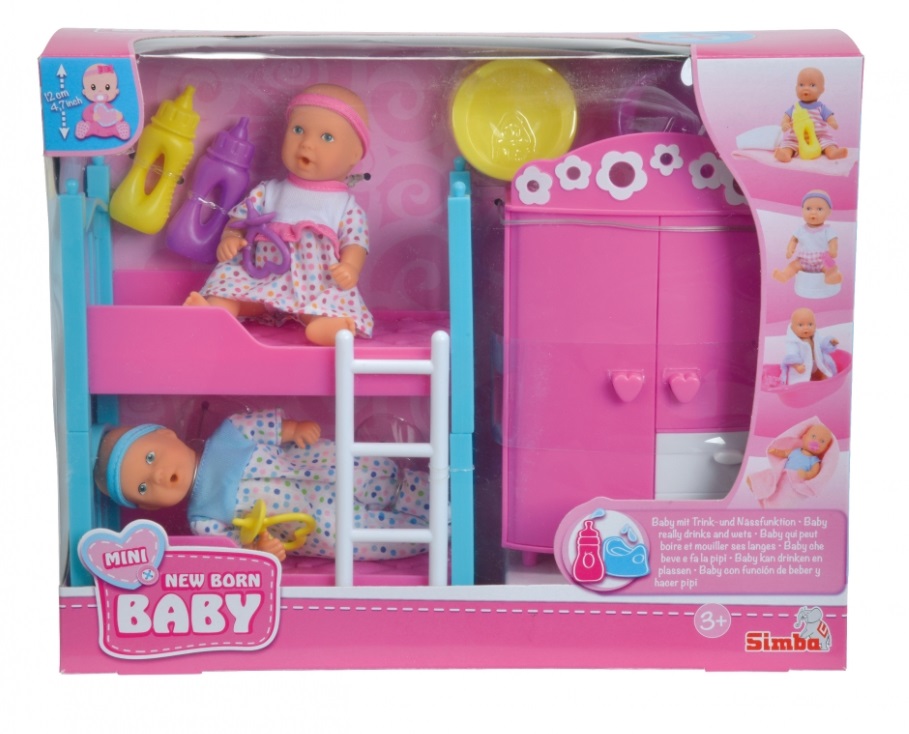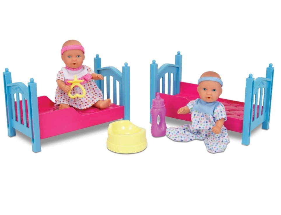 Комплектация: 2 пупса, 2 горшка, 2 соски, 2 бутылочки, двухэтажная кровать, шкафчик.