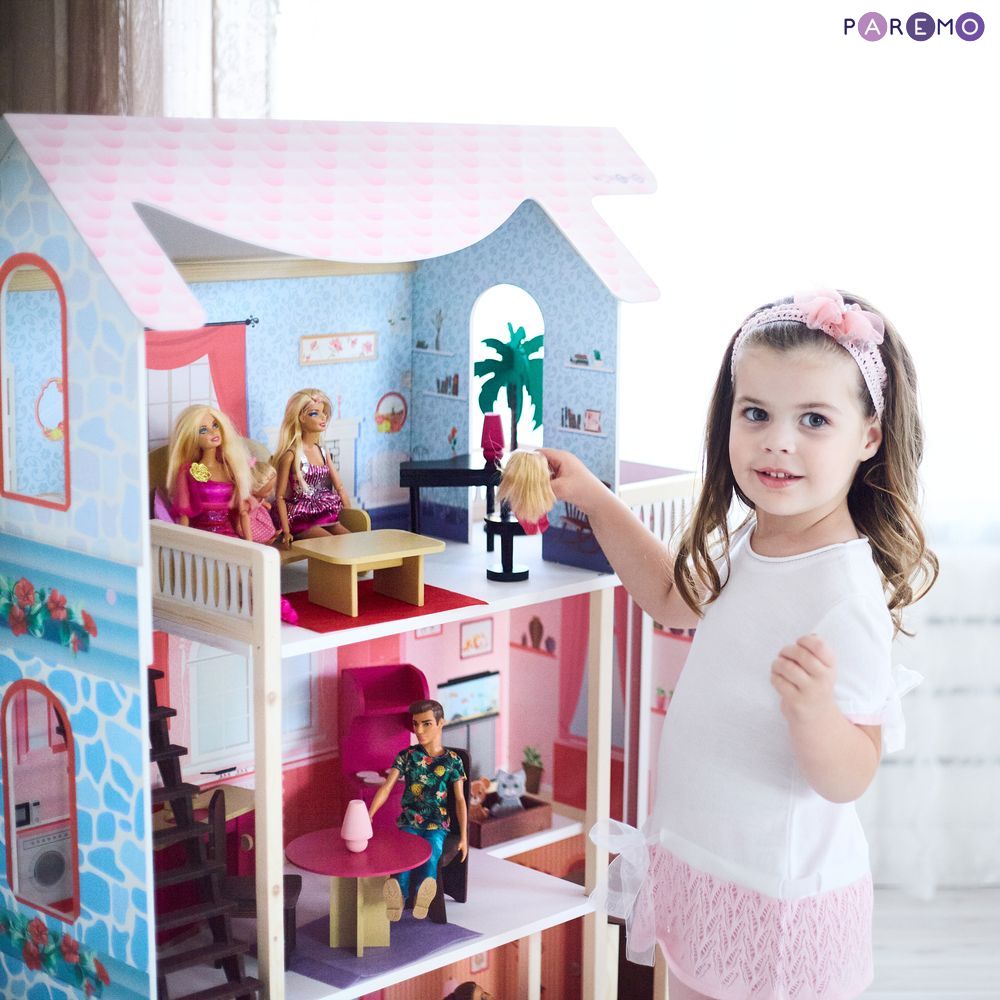 - Современный кукольный домик в розовых оттенках сделает досуг девочек намного интереснее, так как малышки поселят любимых куколок (размер до 30 см.) в красивом особняке с 3 этажами.