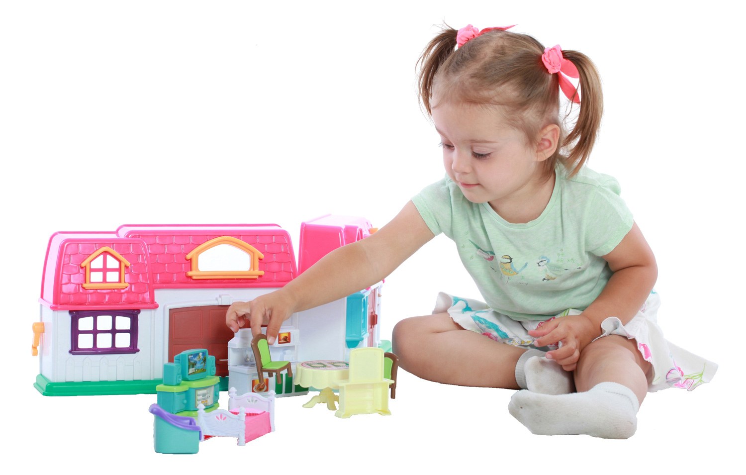 Теперь в комнате девочки появится такой яркий и функциональный домик. Причем его интерьер малышки смогут придумать сами, расставив игровые аксессуары в виде мебели на свой вкус. Потом можно сразу приступить к интереснейшей сюжетно-ролевой игре, так как в комплекте предусмотрены фигурки жителей дома, напоминающее внешне красивую девушку и парня. В процессе этого увлекательного развлечения дети смогут развить свою фантазию и образное мышление, а также улучшат мелкую моторику рук при игре с миниатюрными элементами набора.