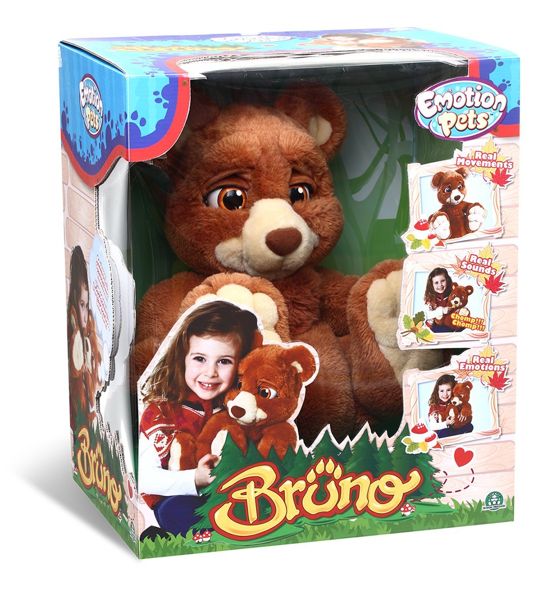 Милый медвежонок Bruno плюшевый и необыкновенный, ведь он словно живой, но очень добрый. Медвежонок любить обниматься, ему необходима ваша ласка и забота. Он может делиться своими эмоциями разными жестами. Например, он может шевелить ушками, лапками, улыбаться, хлопать глазами. Медвежонок реагирует на действия: когда его щекочут, он шевелит лапками и хлопает глазками. Мишка Bruno очень любит мед, если вы будете его кормить из баночки с медом (входящей в комплект), он будет чавкать, еще он может пугаться громких звуков, но как только вы его погладите, он тут же успокоится.