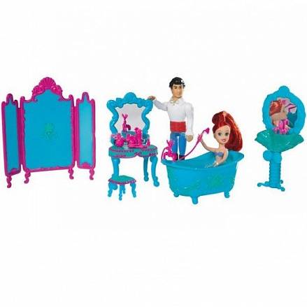 Комплект: фигурки принцессы Ариэль, принца, ванна, ширма, умывальник, зеркало с туалетным столиком, аксессуары.