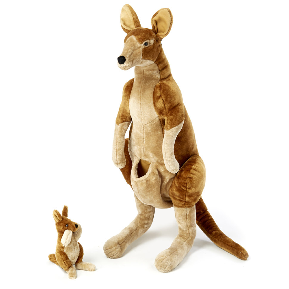 Если ваш малыш мечтает о большой мягкой игрушке, то смело останавливайте свой выбор именно на реалистичном кенгуру, высота которого достигает 87 см. Ведь животное представлено не одно, а в компании со своим очаровательным детёнышем, который так любит прятаться от всех в сумке у мамы.
