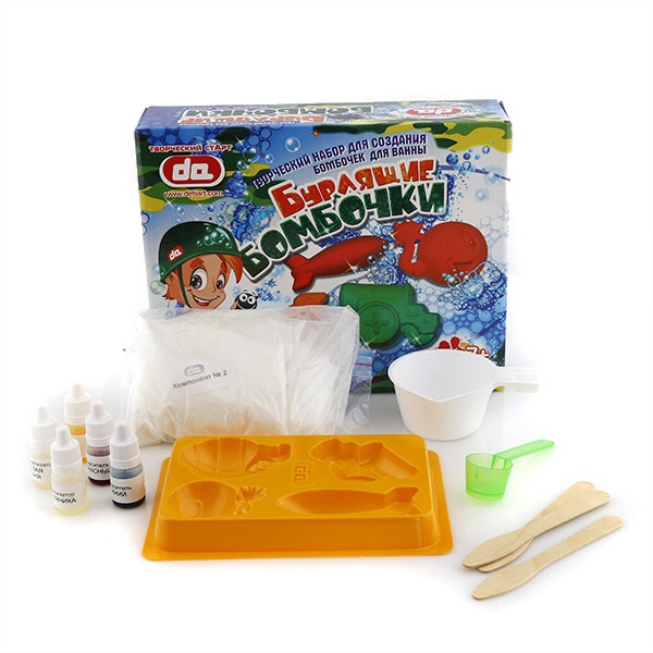 Комплект: 4 формочки, палочки, мерная ложка, перчатки, емкость для перемешивания, инструменты, компоненты для изготовления бомбочек, инструкция.
