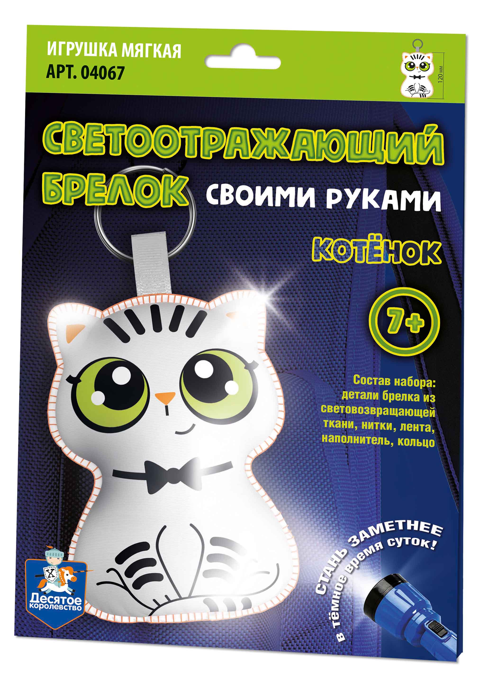 Комплектация: котенок из светоотражающей ткани с напечатанным рисунком (12,5 х 6 см), наполнитель холлофайбер, лента (20 см), нитки мулине (около 1,5 м), металлическое кольцо для брелока.