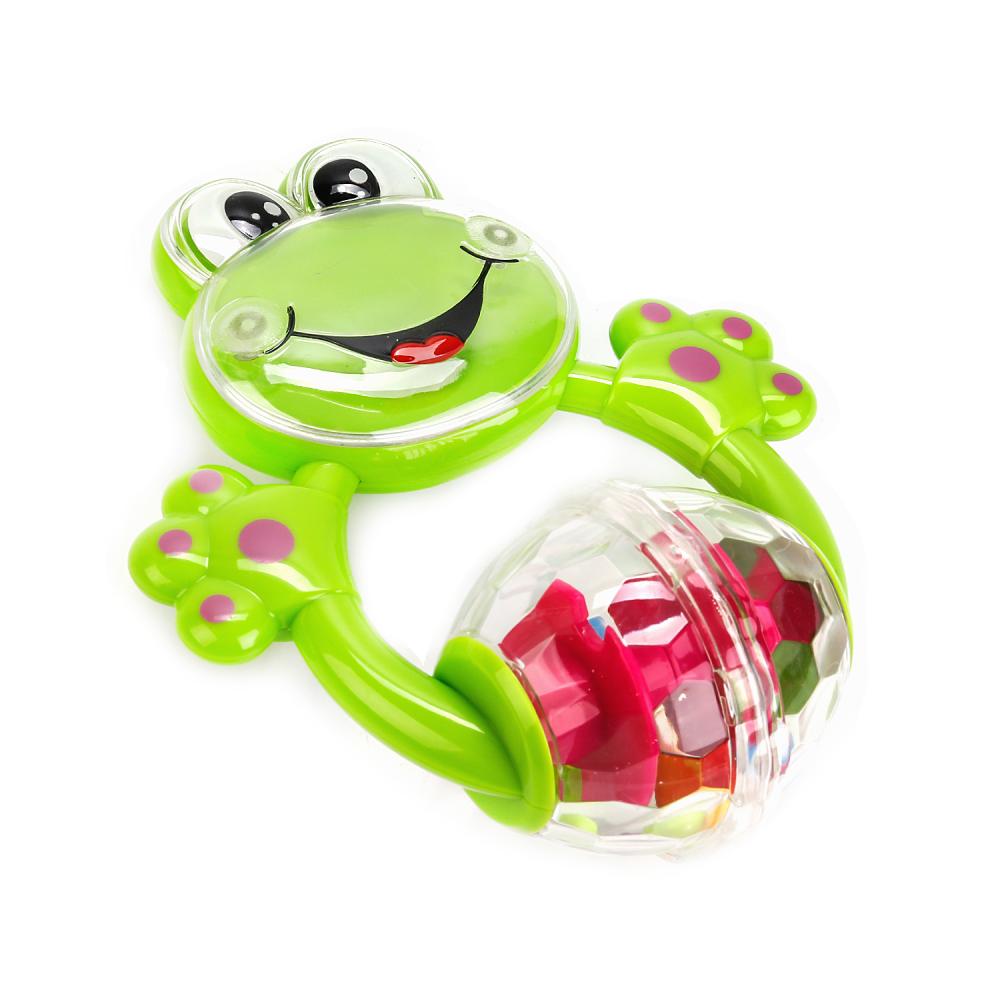 - Погремушка дополнена удобной ручкой, поэтому малыши легко возьмут ее своими пальчиками и даже прихватят лягушку с собой на прогулку.
