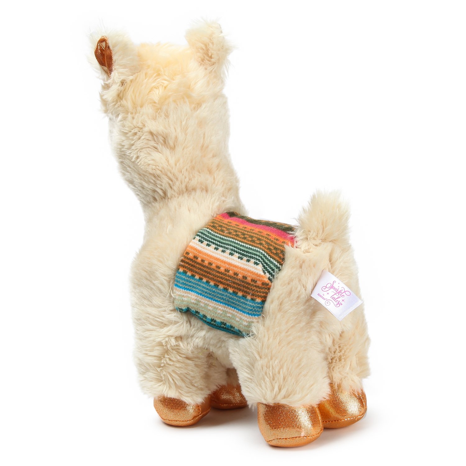 Очаровательная альпака с мягкой бежевой шкуркой, белой мордочкой и выразительными глазками впечатлит ребенка. На спинке альпаки - яркий полосатый коврик, а внутренняя часть ушей и копыта выполнены из золотистого текстиля. С плюшевой игрушкой Ваш ребенок придумает много интересных сюжетов для игры, развивая в ее процессе моторику, тактильную чувствительности и воображение.