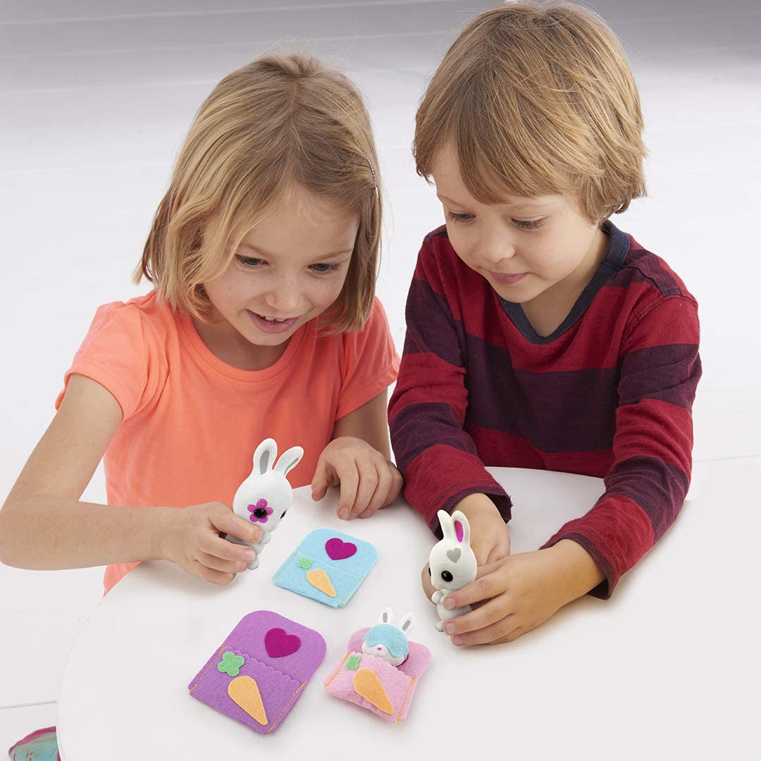 Игровой набор состоит из 3-х флокированных фигурок Кроликов разного размера и 3-х войлочных комплектов для создания персональных спальных мешков для каждого питомца. Создай и задекорируй спальное место для питомца, чтобы уложить его спать.