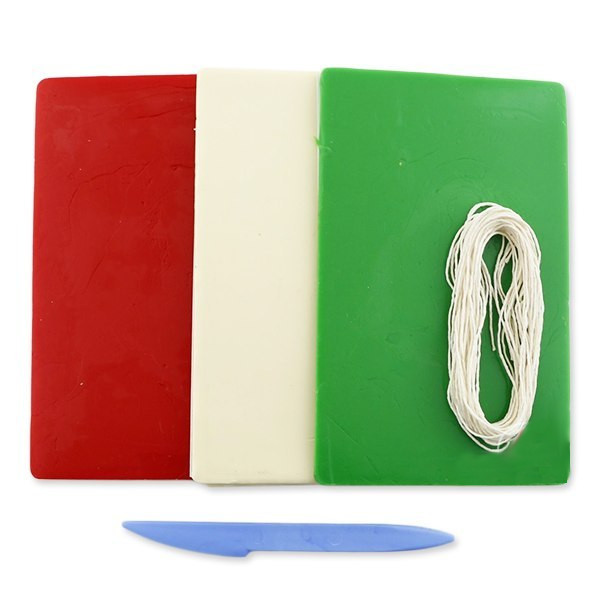 Комплект: 5 восковых пластин (2 белых, 2 красных, 1 зелёная), фитиль, стек, инструкция.