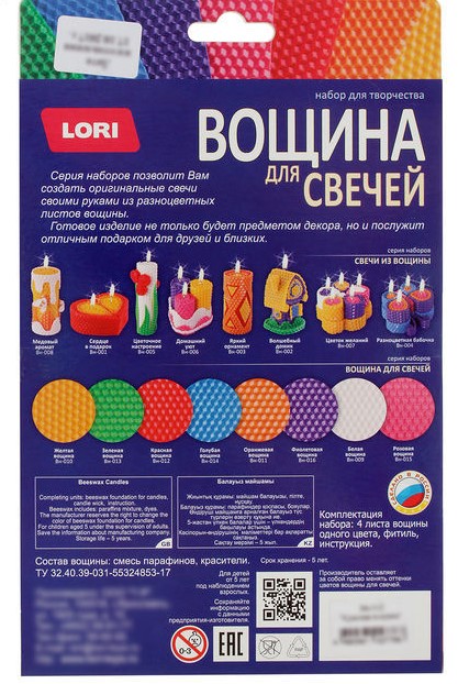 В комплекте: 4 пластинки вощины голубого цвета, фитиль, подробная инструкция.