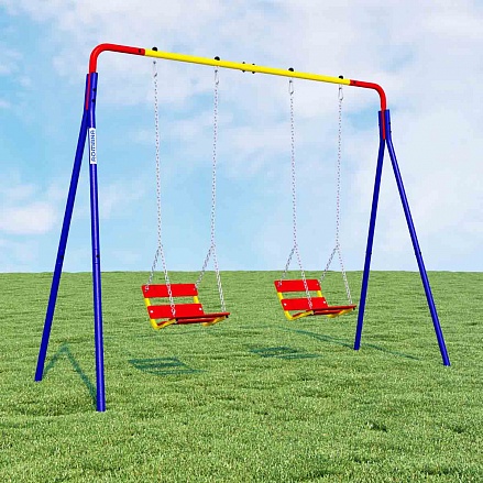 - Конструкция качелей состоит из металлического каркаса и двух сидений со спинками на цепочках.