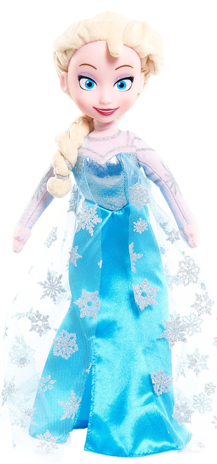 Белокурая принцесса Эльза из любимого многими детьми мультика «Холодное сердце», выполнена с особой тщательностью и передаёт всё красоту присущую её экранному прототипу. У игрушки милые черты лица с нарисованными глазами, длинные ресницы придают им особенную выразительность. На кукле красивое голубое платье, сшитое из текстиля и плюша. Волосы куклы заплетены в плотную косу. Тело куклы имеет среднюю плотность набивки, а лицо выполнено из качественного пластика, приятного для тактильных ощущений ребёнка. Очаровательная принцесса развеселит ребёнка исполнением песенки "Отпусти и забудь!" на английском языке.