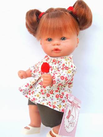 Небольшой пупсик от итальянской компании «ASI» не смотря на свой миниатюрный размер, выполнен очень подробно и реалистично. Миловидные черты лица черты лица выполнены очень тщательно, у девочки выразительные глаза. Короткие светлые волосы собраны в пару очаровательных хвостиков, которые придают ей озорной вид.