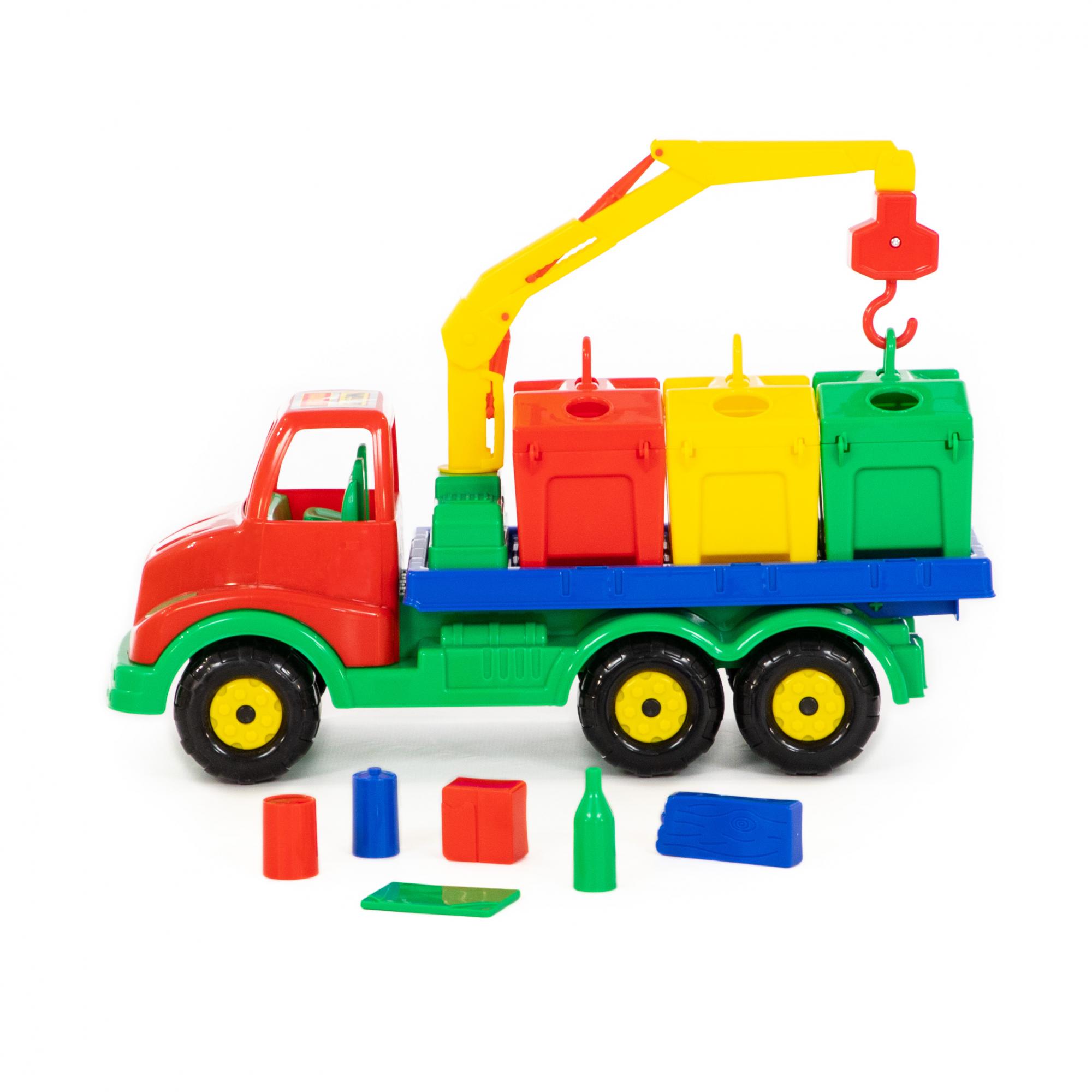 - Дети смогут изображать не только движение техники, катая ее по ровной поверхности, но и перемещение контейнеров, используя кран с крюком, внутрь баков можно разместить имитации бытовых отходов.