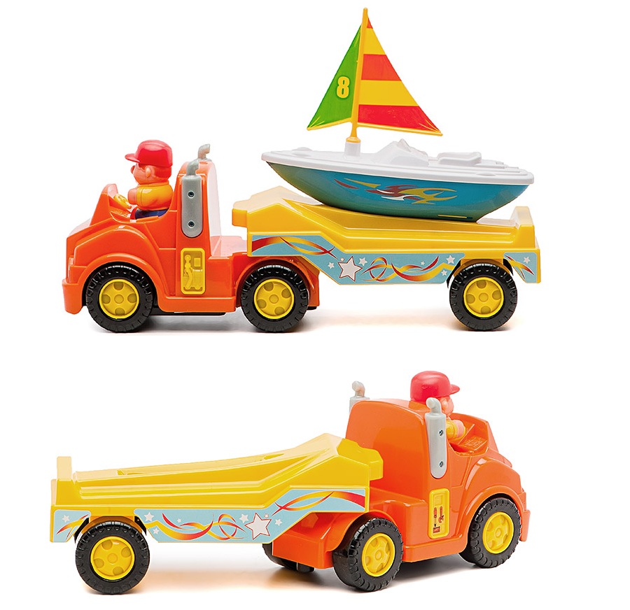Веселый водитель везет яхту на своем ярком трейлере, чтобы спустить ее на воду, и приглашает малыша в увлекательное путешествие! Прицеп легко отцепляется от трейлера, а с яхтой можно поиграть в воде. Яркая Игрушка выполнена из яркого и безопасного для детей пластика. Любая игра с забавным трейлером станет еще интереснее и увлекательнее.