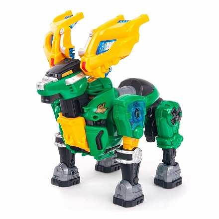 - Ребенок сможет самостоятельно превратить копию героя мультфильма «Металионс» Вапити в боевого робота.