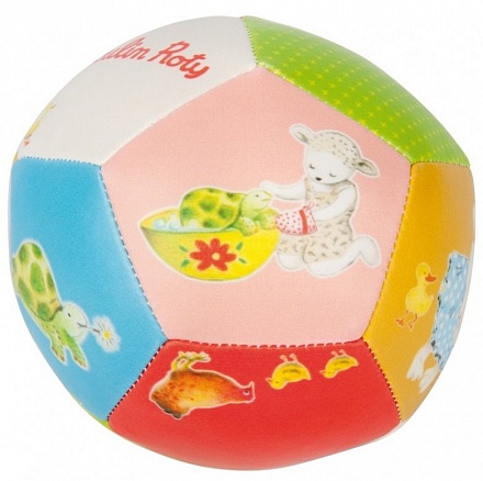 - Она представляет собой небольшой мячик с ярким, красочным исполнением. Он состоит из цветных пятиугольников в каждом из которых нарисовано определенное животное, например, овечка, купающая в тазу черепашку, уточка, курочка с цыплятами, кролик, и прочие.