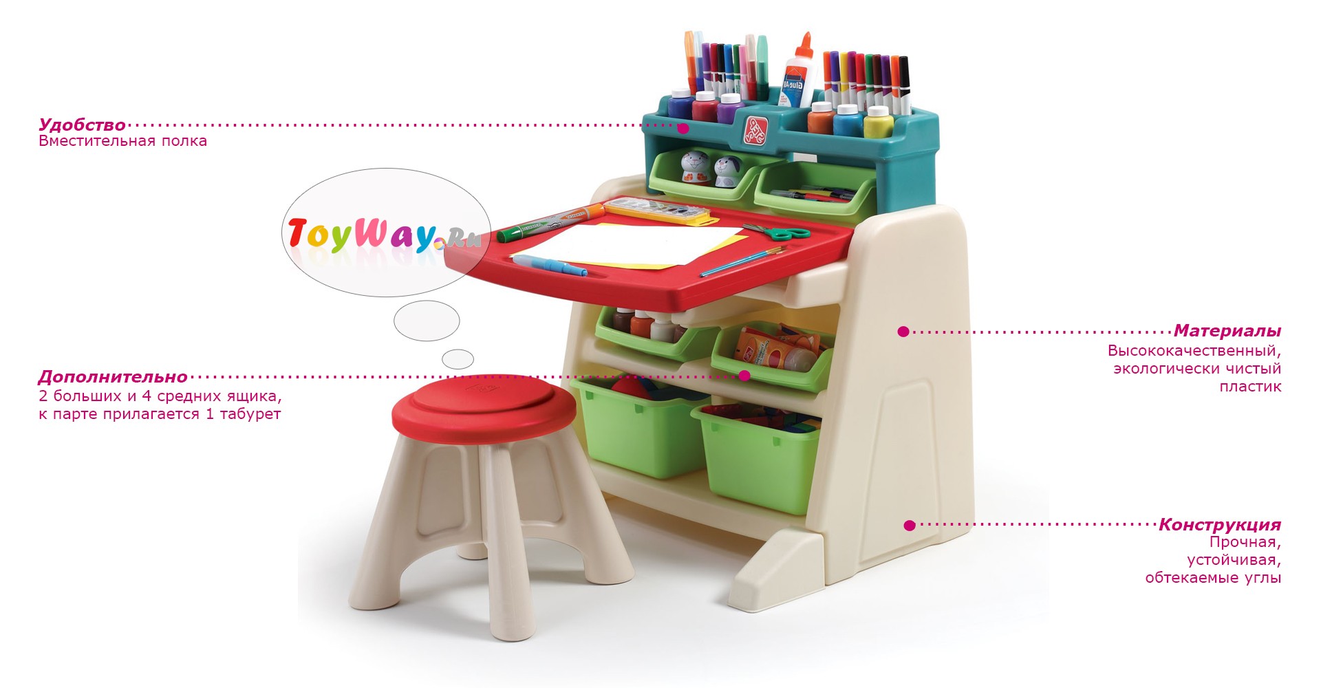 - Стол обладает широкой поверхностью, удобной для занятия творчеством.