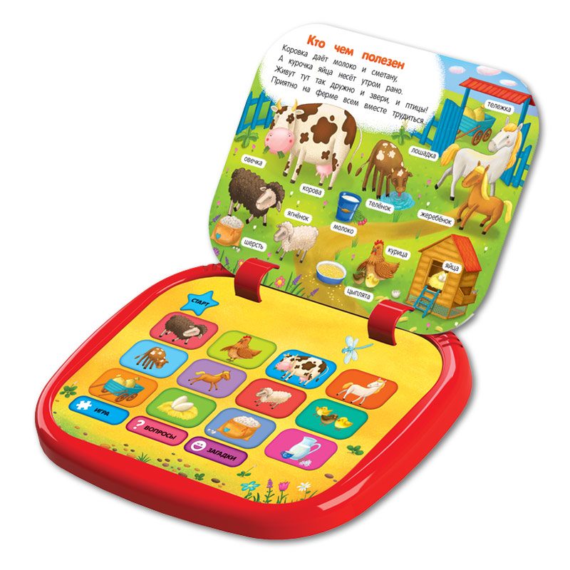 Этот планшет представляет собой своеобразную интерактивную книгу, изучая странички которой, ваш ребенок узнает много новой и полезной для него информации. Нажимая на понравившихся персонажей, он увидит, как они оживут, а загрузив специальное приложение на телефон получится поупражняться в пении.