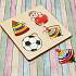 - Развивающая доска представлена рамкой с вкладышами, выполненными в виде детских игрушек: неваляшки, пирамидки, юлы и мячика.
