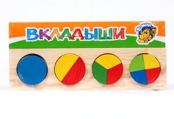 Доска-вкладыш – полезная игрушка, выполненная из натурального дерева, все её элементы тщательно отработаны и выкрашены в яркие цвета. Доска имеет круглые пазы, в которые ребёнок будет вкладывать целый круг или его части, чтобы получить целую фигуру. Игра развивает память, внимание, концентрацию на задаче и моторику рук, а также знакомит ребёнка с понятием долей геометрических фигур.