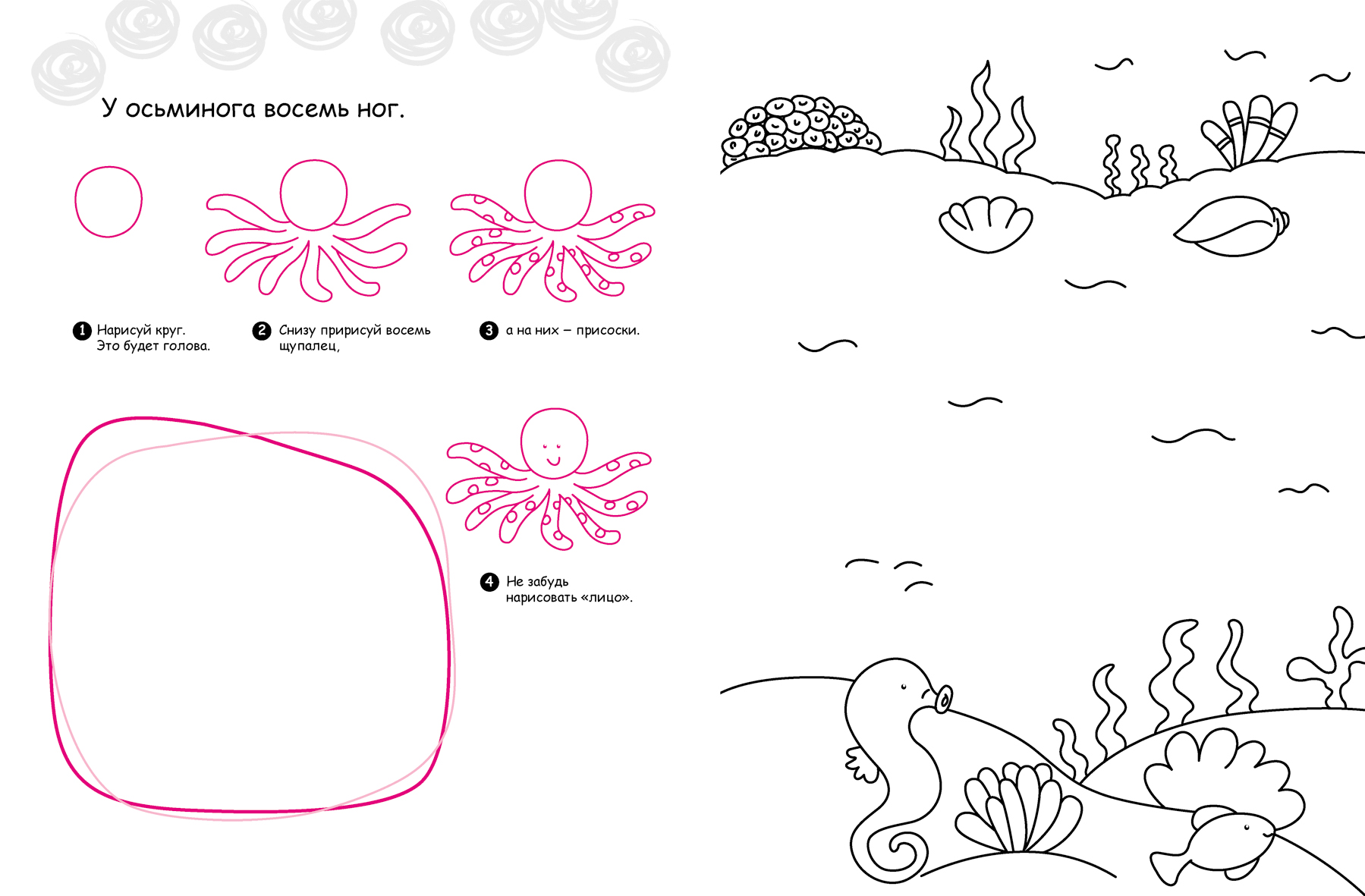 На левой стороне учимся рисовать, на правой же проверяем свое мастерство и вписываем морского обитателя в свою среду обитания, а потом раскрашиваем дополненную картинку.