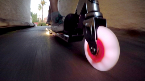 - Особенно эффектным катание на самокате будет в вечернее время, когда будет заметно, что колеса транспортного средства светятся (без использования батареек).