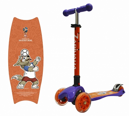 Трехколесный самокат от компании «1Toy» привлечет внимание маленьких болельщиков футбола. Его платформа декорирована красочной наклейкой с изображением прошедшего в Москве чемпионата по футболу FIFA 2018 - Волка Забиваки. Передние колеса из полиуретана со светом, поэтому родители смогут издалека наблюдать за катанием ребенка даже во время вечерних прогулок.