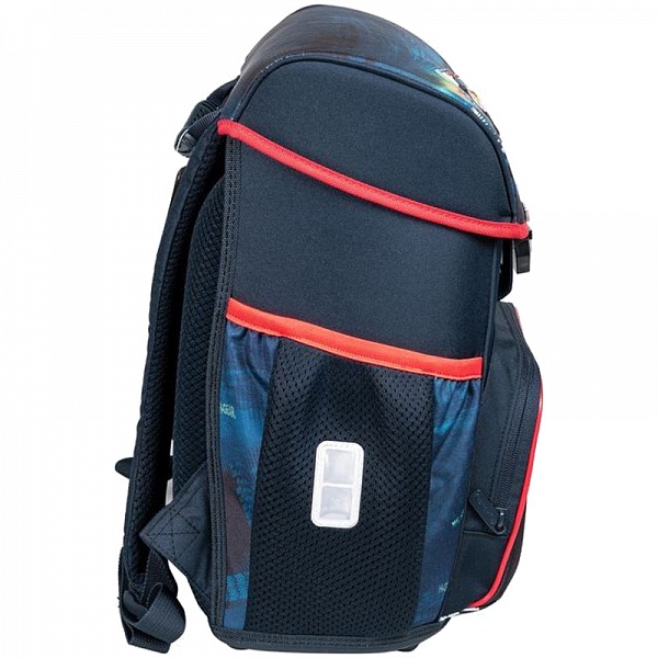 - Ранец имеет прямоугольную форму, основное отделение закрывается на замок-защелку из прочного пластика со встроенными светоотражающими элементами.