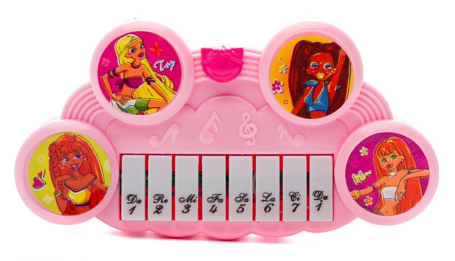 - Игрушка выполнена в виде розового пианино, а в верхней его части размещены декоративные наклейки с красивыми девушками.