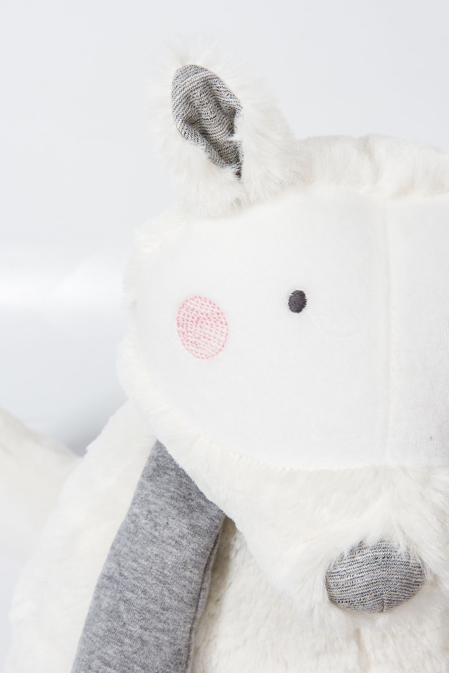 - Очаровательное игрушечное животное обожает сидеть, вытянув ножки, у него тельце белоснежного цвета, маленькие ушки и хвостик, передние лапки серенькие, а задние в разноцветную полоску.