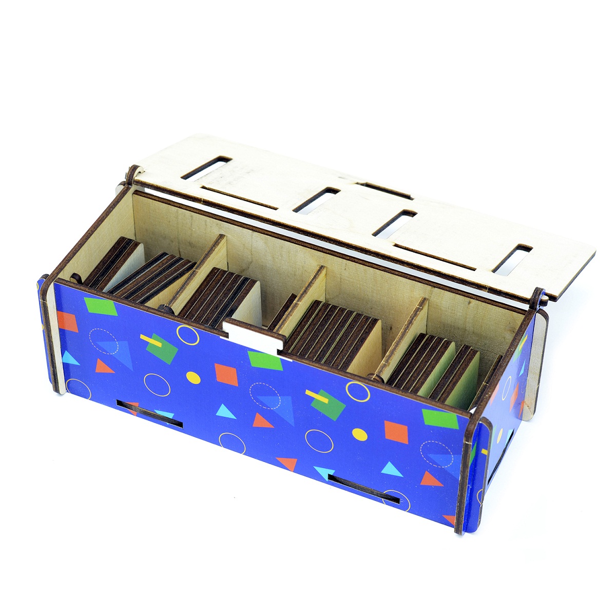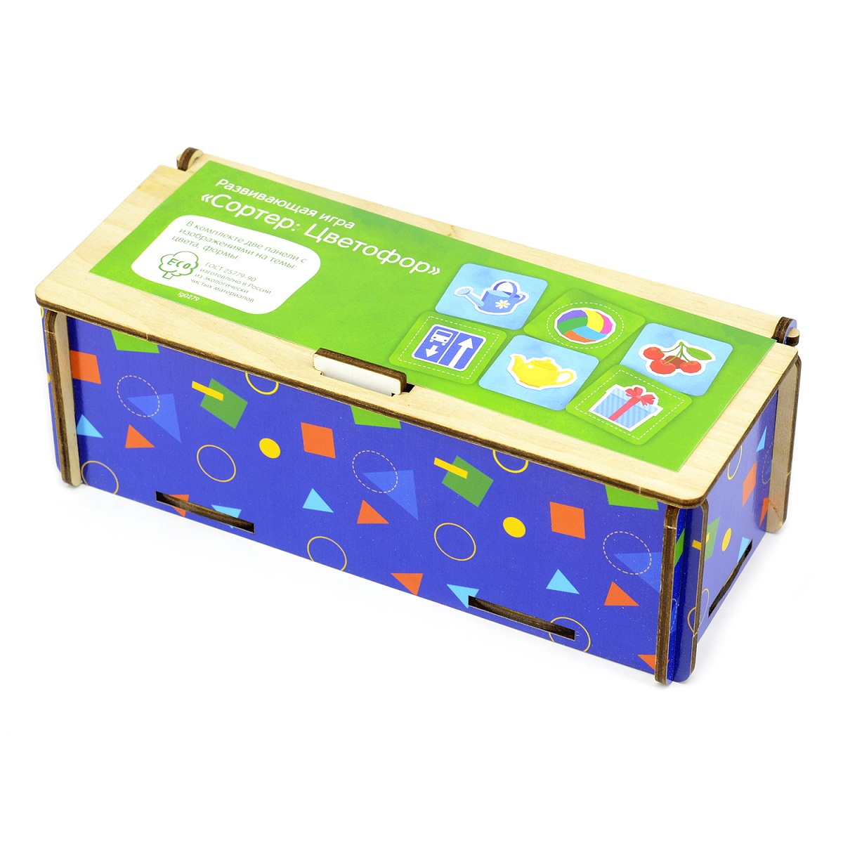 Комплект: сортер-деревянная коробка с прорезями, фишки, тематические панели с комбинациями расположения цветов.