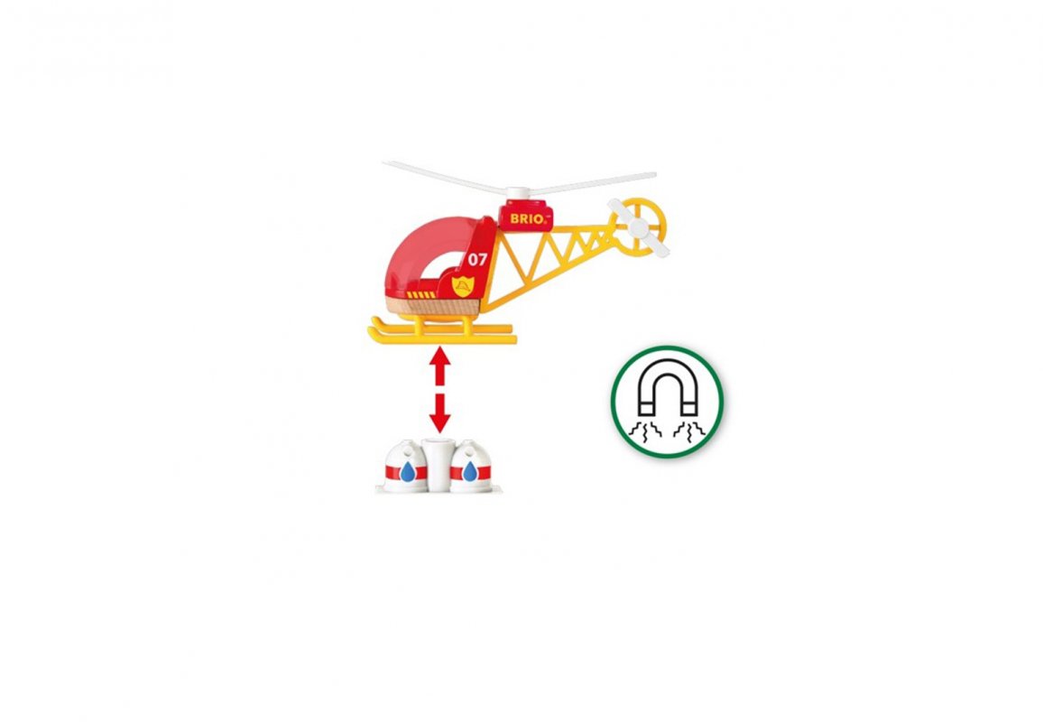 Примечание: чтобы игры ребенка с вертолетом были еще интереснее, рекомендуем дополнительно приобрести – Поезд Пожарная машина (Brio, 33576).