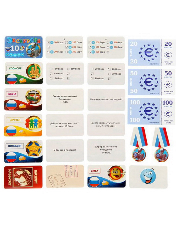 Комплектация: игровое поле, 4 фигурки, игральная кость, книжка с вопросами и ответами, 20 карт Экскурсия, 6 карт Полиция, 6 карт Друзья, 6 карт Проблема, 8 карт Смех, 10 карт Удача, 12 карт Спонсор, 4 карты Паспорт, 24 карты Медаль, 60 банкнот.