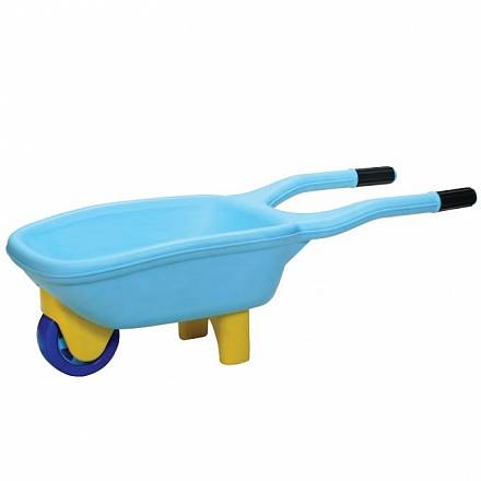 - Тачка выполнена в голубом цвете, в ее передней части располагается колесо, благодаря которому ее получится легко привести в движении, а с другой стороны находятся две выступающие ручки с черными рукоятками, за которые ребенку будет удобно держаться в процессе катания такой тачки.