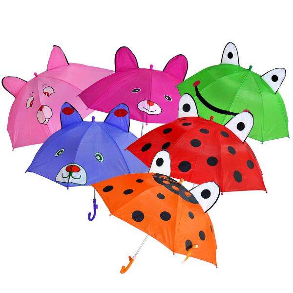- Внимание детей привлечет яркий дизайн зонта с забавными ушками и мордашками на корпусе.