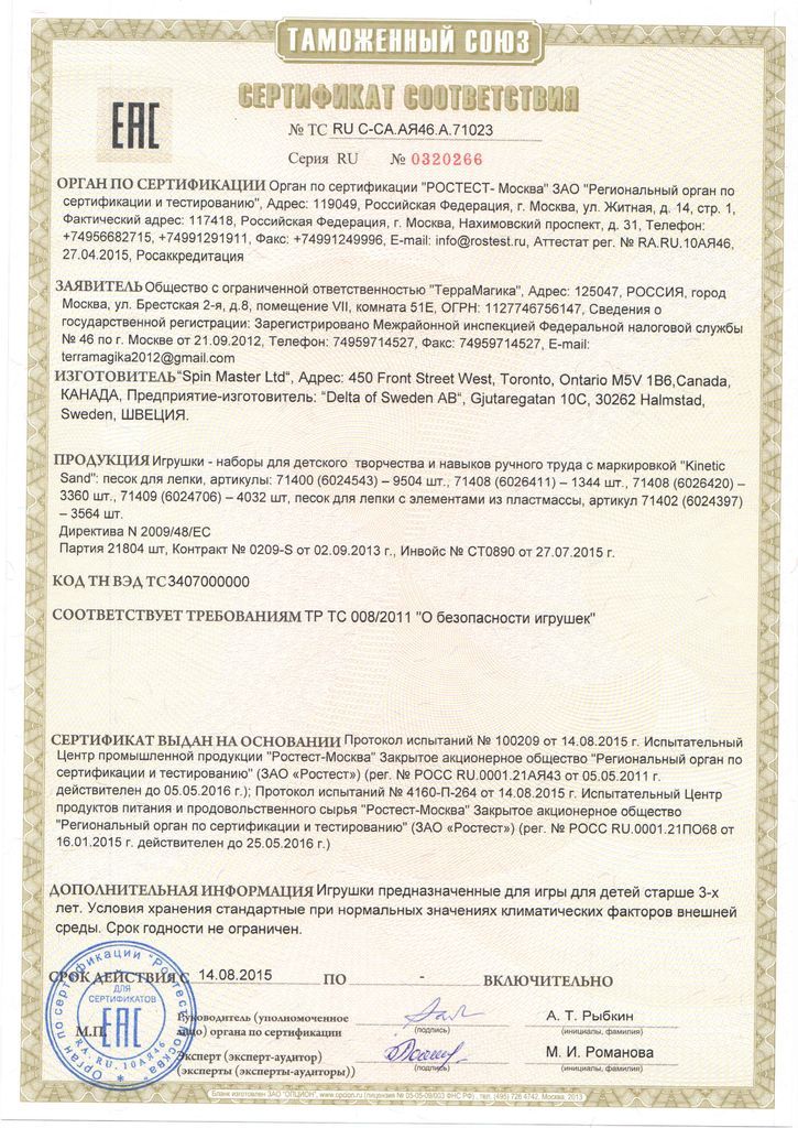 Марка Kinetic Sand - сертификат соответствия Марка Kinetic Sand - сертификат соответствия Марка Kinetic Sand - сертификат соответствия